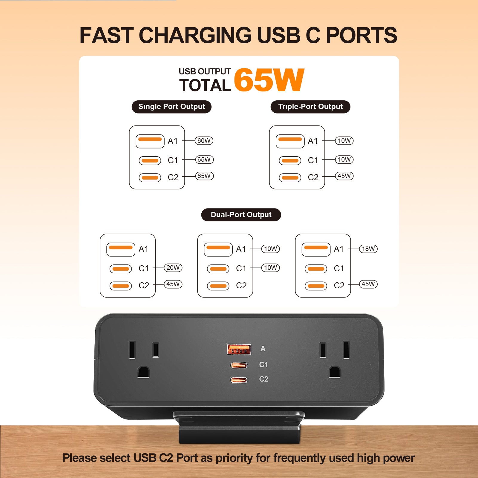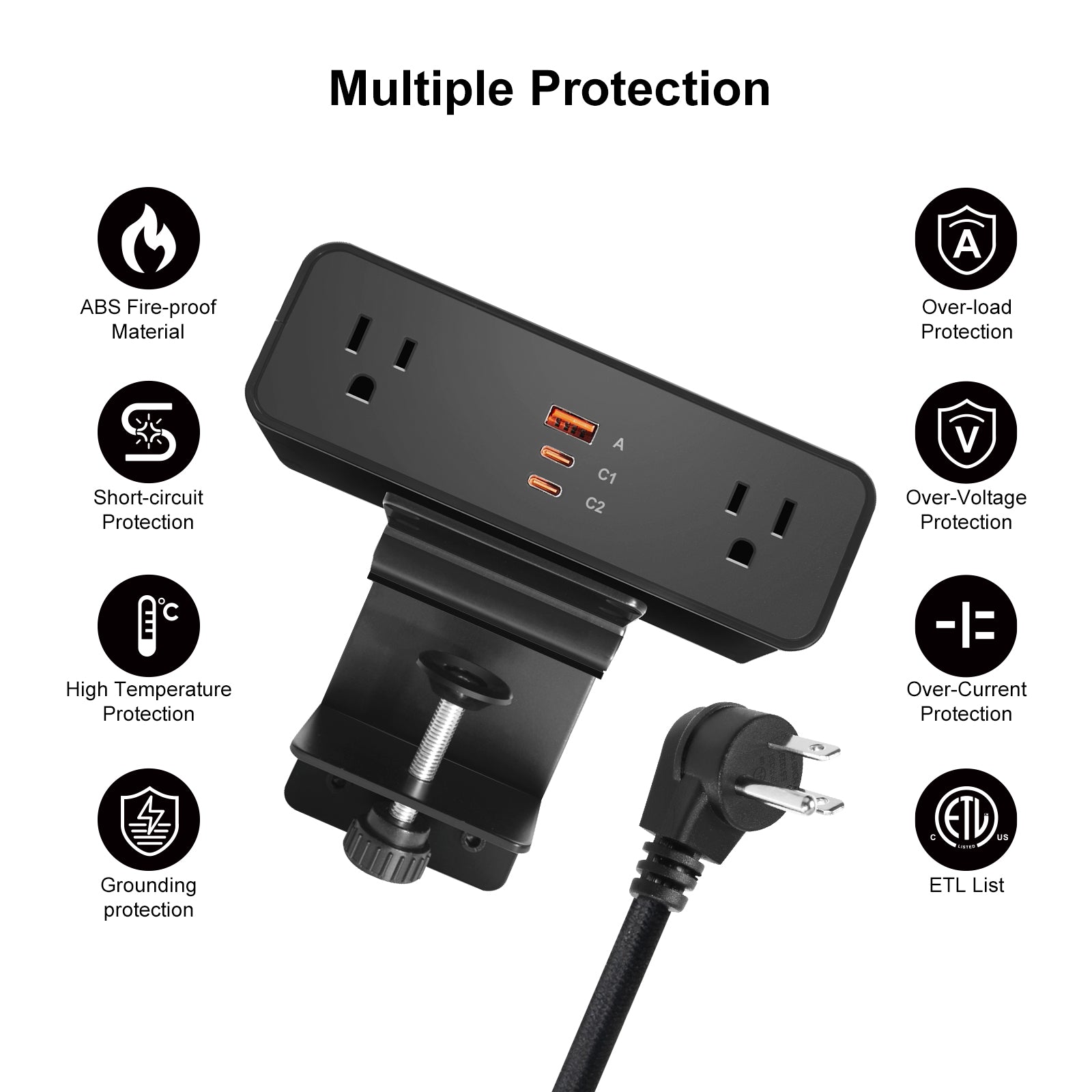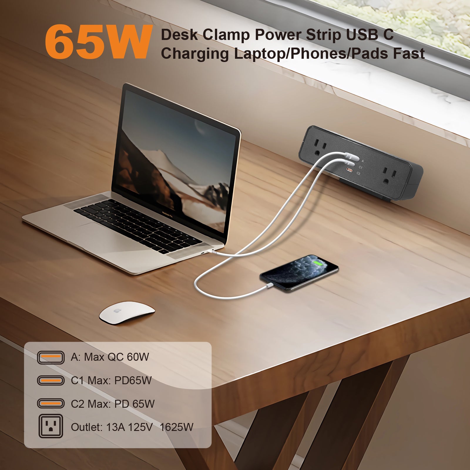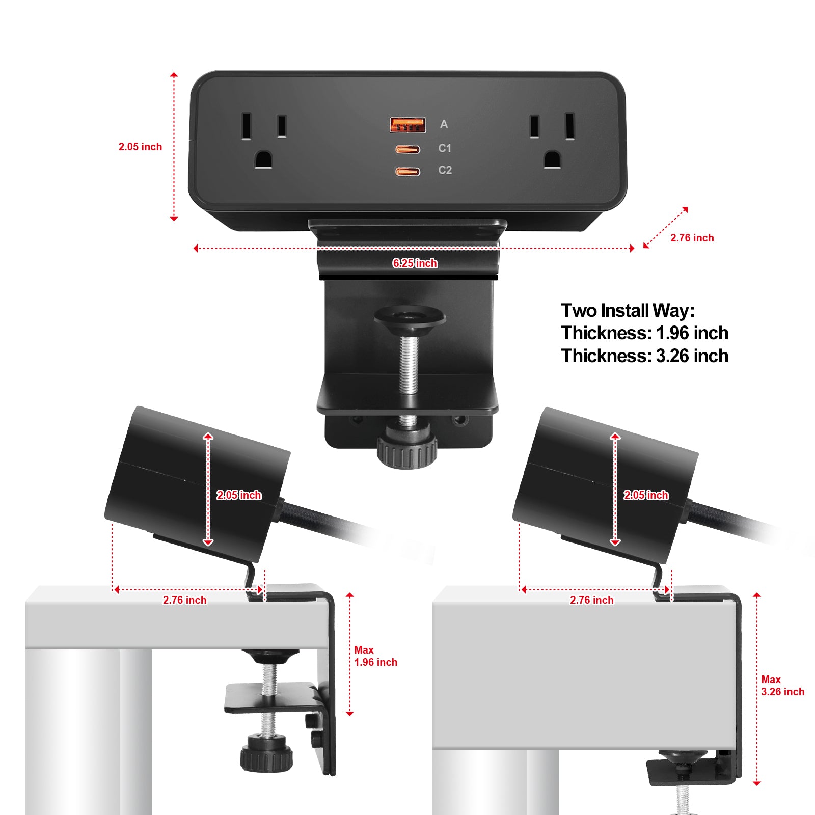 Desk Mount PD 100W USB-C Power Outlets: The USB-C port supports up to 100W power delivery, capable of charging Laptop MacBooks directly. With the latest PD 3.0 technology, the 100W desktop clamp power strip can power your MacBook Pro/Air from 0% to 100% in just 1 hours