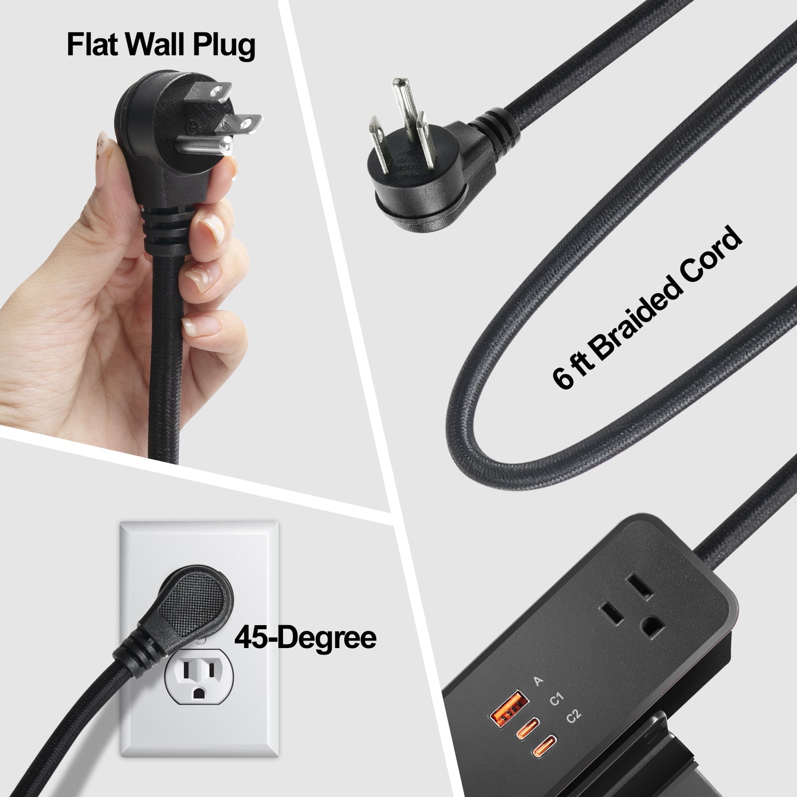 Long Heavy duty Extension Cord: The desktop power strip with usb ports, equipped with 6ft extension cord. The extension cord made with braided with flat plug which is more durable and high current-carrying.